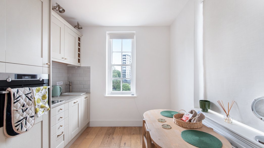 The apartment features a generous reception room with excellent ceiling height and proportions, creating an inviting central living space. The adjoining kitchen is fitted with modern cabinetry and integrated appliances. A large terrace provides valuable additional space and enhances the overall sense of light and openness throughout the apartment.
